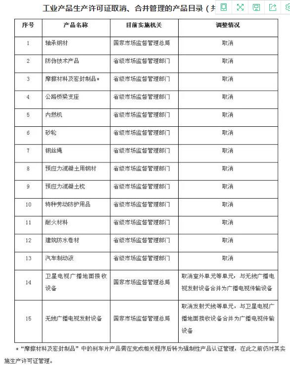 經(jīng)研究論證,國(guó)務(wù)院決定,壓減工業(yè)產(chǎn)品生產(chǎn)許可證管理目錄,取消內(nèi)燃機(jī)、汽車制動(dòng)液等13類工業(yè)產(chǎn)品生產(chǎn)許可證管理,將衛(wèi)星電視廣播地面接收設(shè)備與無(wú)線廣播電視發(fā)射設(shè)備2類產(chǎn)品壓減合并為1類,對(duì)其中涉及安全、健康、環(huán)保的,轉(zhuǎn)為強(qiáng)制性產(chǎn)品認(rèn)證管理,認(rèn)證費(fèi)用由財(cái)政負(fù)擔(dān)。調(diào)整后繼續(xù)實(shí)施工業(yè)產(chǎn)品生產(chǎn)許可證管理的產(chǎn)品共計(jì)10類,其中,由國(guó)家市場(chǎng)監(jiān)督管理總局實(shí)施的5類,由省級(jí)市場(chǎng)監(jiān)督管理部門(mén)實(shí)施的5類。