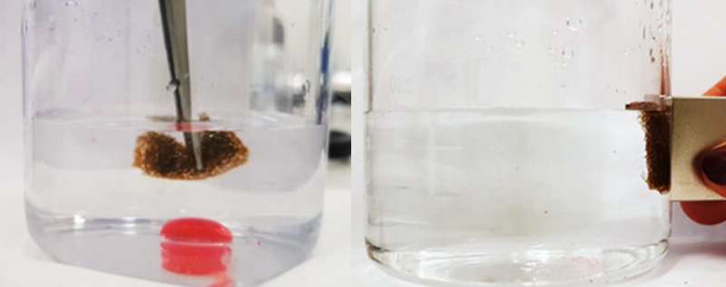 “第二個問題是找到一種有效的方法,從水中去除這種物質(zhì)。我們選擇了磁性吸附劑系列。我們在海綿的結(jié)構(gòu)中加入了鐵納米粒子,這是通過我們原始方法獲得的,其特征是對非極性分子的敏感性增加。我們還添加了疏水性有機基團。結(jié)果,我們得到的材料幾乎不與水相互作用,盡管它是一塊海綿,”這位科學(xué)家解釋說。