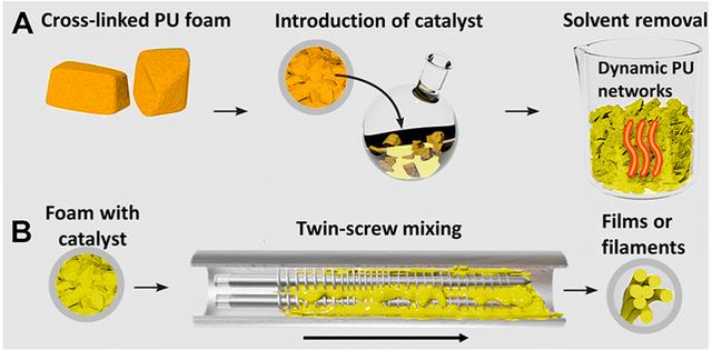 近期,西北大學的William R. Dichtel教授將二月桂酸二丁基錫(DBTDL)引入交聯的PU泡沫中,通過動態氨基甲酸酯交換反應使泡沫具有可塑性,然后使用雙螺桿擠出機去除泡沫中的空氣,形成一種比原PU泡沫價值更高的材料,這種材料具有較強重塑性,可加工成堅硬耐用的塑料或柔軟彈性的薄膜,用于汽車保險杠、表帶、購物車或滑板輪等產品。這項技術將使商用PU廢料進一步回收利用,并推動其他熱固性材料再處理的進一步發展!