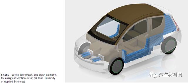 德國特里爾應用科技大學(TheTrier University of Applied Sciences)的一個研發團隊針對當地的交通狀況(theproTRon Evolution),開發了一款高能效電動汽車。該車的結構件和外覆蓋件由天然纖維增強復合材料(NFRP,NaturalFiber ReinforcedPlastic)制成。雖然亞麻纖維增強復合材料的強度有限,一般用于低負載部件,但通過優化的結構設計,該車輛仍滿足了歐洲M1道路的碰撞安全要求。