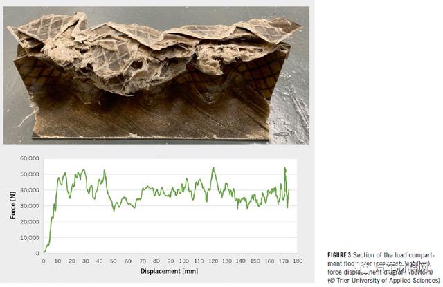 亞麻纖維的比重比碳纖維低,而強度和彈性模量值與玻璃纖維相似。由于它們僅需要大約1-5%的能量輸入,在生產過程中會顯著降低CO2排放,因此車輛的整體能量平衡性具有優勢。亞麻纖維增強組件在減振、發生碰撞時的碎裂行為方面提供了顯著優勢,并且沒有有害的纖維粉塵,方便處置或回收利用。目前,NFRP材料用于高應力部件的可靠材料數據和經驗相對較少。因此,該項目的主要致力于確定材料特性并進一步開發尺寸標注方法。通過使用有限元方法(FEM)進行計算,可以實現結構優化,對其中涉及到的纖維層數、鋪層方向和順序進行模擬,通過靜態和動態載荷測試進行了驗證(具體如圖2)。在考慮前、后和側面碰撞安全性時,NFRP制成的部件可通過管狀或波浪形結構的壓碎實現約30kJ/kg的比能量吸收,這是傳統鋼制碰撞盒比能量吸收的兩倍左右,具體測試結果如圖3所示。
